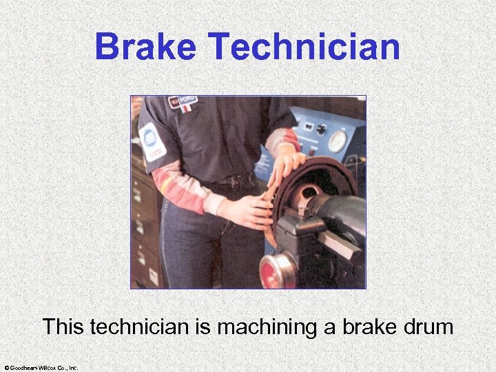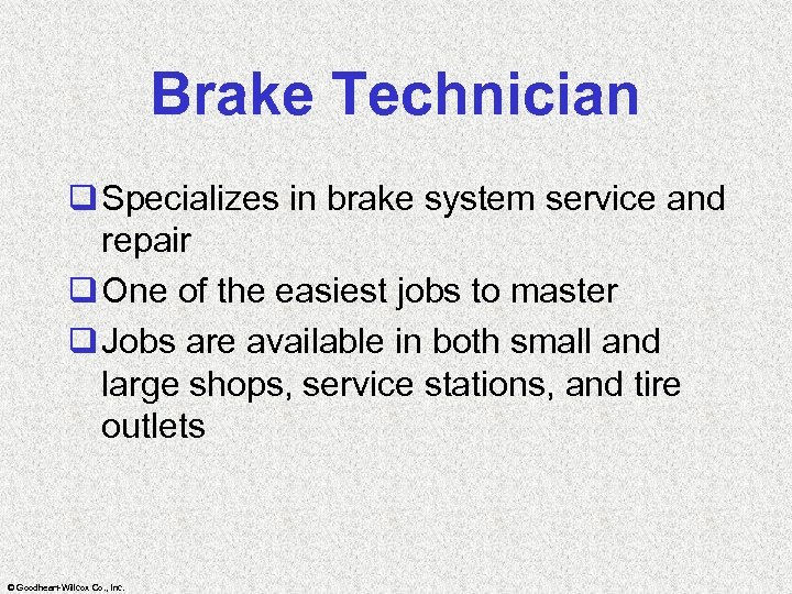 Brake Technician q Specializes in brake system service and repair q One of the easiest jobs to master q Jobs are available in both small and large shops, service stations, and tire outlets © Goodheart-Willcox Co. , Inc.