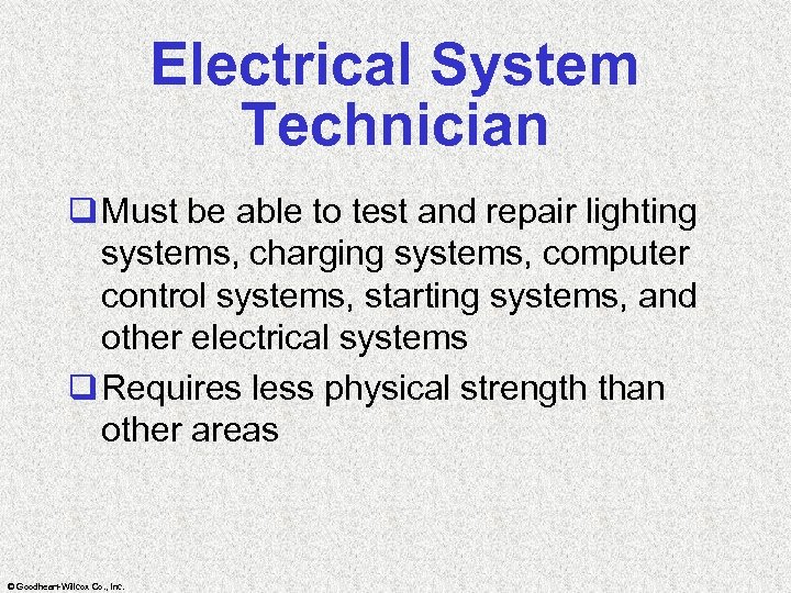 Electrical System Technician q Must be able to test and repair lighting systems, charging systems, computer control systems, starting systems, and other electrical systems q Requires less physical strength than other areas © Goodheart-Willcox Co. , Inc.
