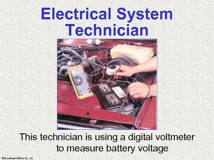 Electrical System Technician This technician is using a digital voltmeter to measure battery voltage © Goodheart-Willcox Co. , Inc.