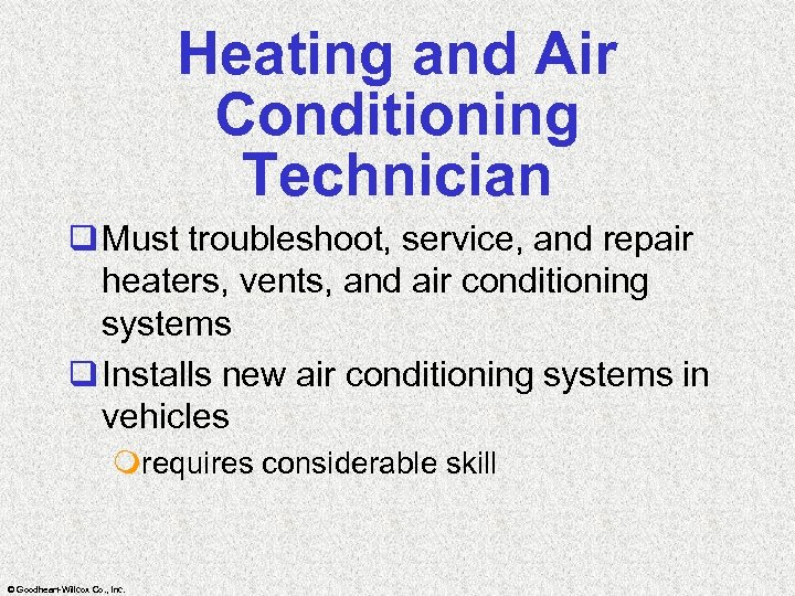 Heating and Air Conditioning Technician q Must troubleshoot, service, and repair heaters, vents, and air conditioning systems q Installs new air conditioning systems in vehicles mrequires considerable skill © Goodheart-Willcox Co. , Inc.