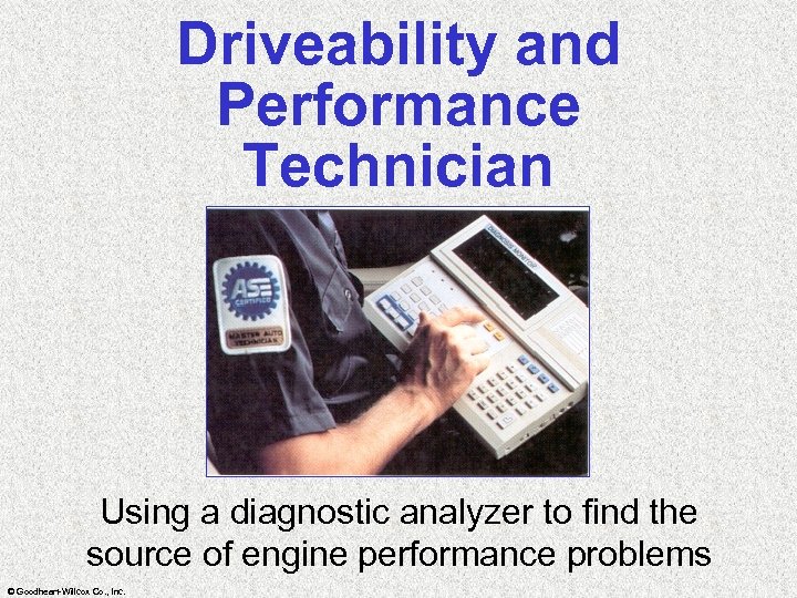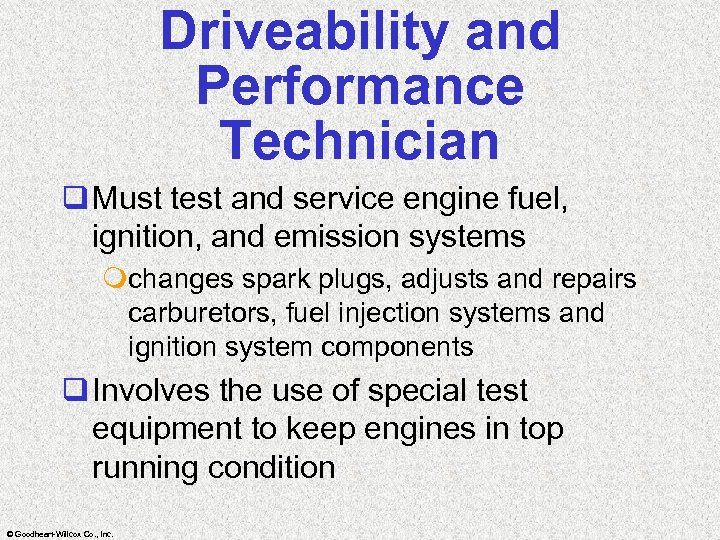 Driveability and Performance Technician q Must test and service engine fuel, ignition, and emission systems mchanges spark plugs, adjusts and repairs carburetors, fuel injection systems and ignition system components q Involves the use of special test equipment to keep engines in top running condition © Goodheart-Willcox Co. , Inc.