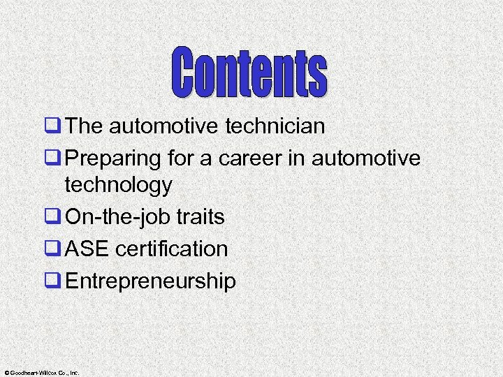 q The automotive technician q Preparing for a career in automotive technology q On-the-job traits q ASE certification q Entrepreneurship © Goodheart-Willcox Co. , Inc.
