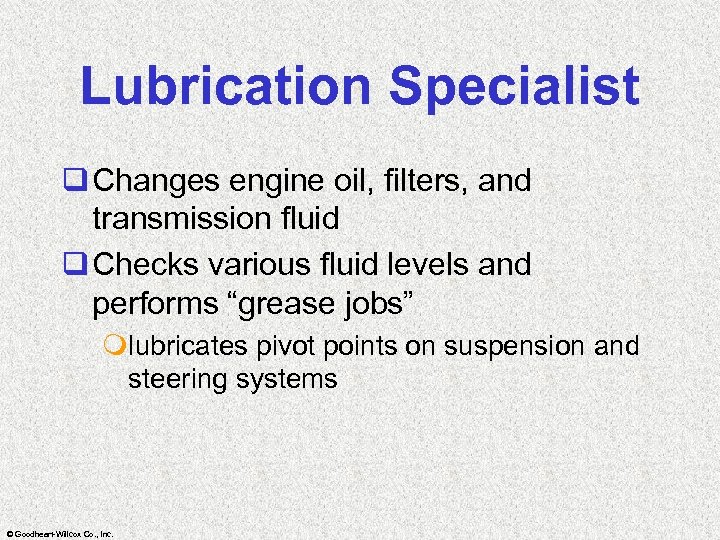 Lubrication Specialist q Changes engine oil, filters, and transmission fluid q Checks various fluid levels and performs “grease jobs” mlubricates pivot points on suspension and steering systems © Goodheart-Willcox Co. , Inc.