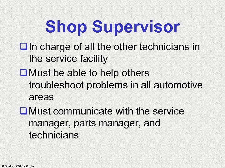 Shop Supervisor q In charge of all the other technicians in the service facility q Must be able to help others troubleshoot problems in all automotive areas q Must communicate with the service manager, parts manager, and technicians © Goodheart-Willcox Co. , Inc.