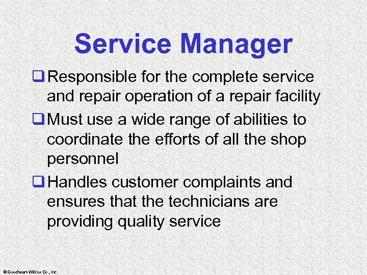 Service Manager q Responsible for the complete service and repair operation of a repair facility q Must use a wide range of abilities to coordinate the efforts of all the shop personnel q Handles customer complaints and ensures that the technicians are providing quality service © Goodheart-Willcox Co. , Inc.