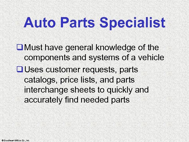 Auto Parts Specialist q Must have general knowledge of the components and systems of a vehicle q Uses customer requests, parts catalogs, price lists, and parts interchange sheets to quickly and accurately find needed parts © Goodheart-Willcox Co. , Inc.
