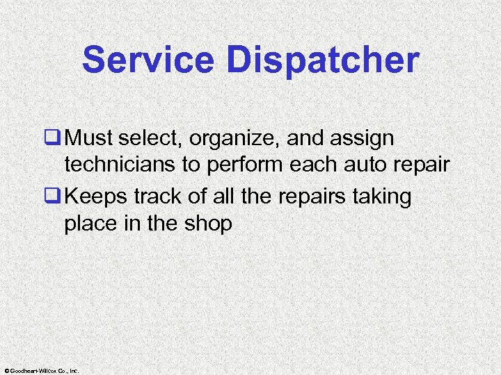 Service Dispatcher q Must select, organize, and assign technicians to perform each auto repair q Keeps track of all the repairs taking place in the shop © Goodheart-Willcox Co. , Inc.