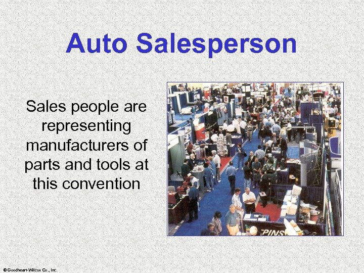 Auto Salesperson Sales people are representing manufacturers of parts and tools at this convention © Goodheart-Willcox Co. , Inc.