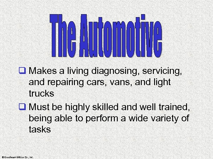 q Makes a living diagnosing, servicing, and repairing cars, vans, and light trucks q Must be highly skilled and well trained, being able to perform a wide variety of tasks © Goodheart-Willcox Co. , Inc.
