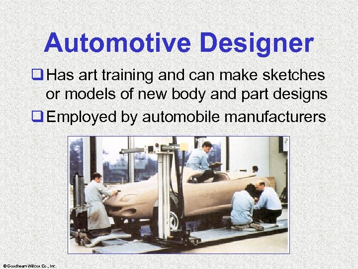 Automotive Designer q Has art training and can make sketches or models of new body and part designs q Employed by automobile manufacturers © Goodheart-Willcox Co. , Inc.