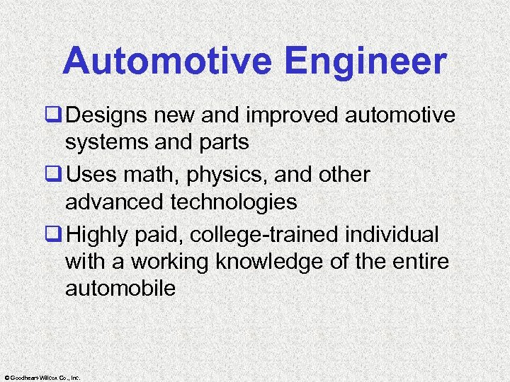 Automotive Engineer q Designs new and improved automotive systems and parts q Uses math, physics, and other advanced technologies q Highly paid, college-trained individual with a working knowledge of the entire automobile © Goodheart-Willcox Co. , Inc.