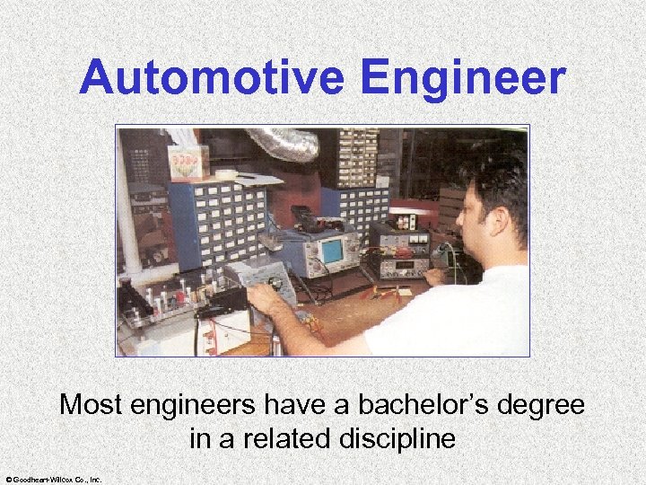 Automotive Engineer Most engineers have a bachelor’s degree in a related discipline © Goodheart-Willcox Co. , Inc.