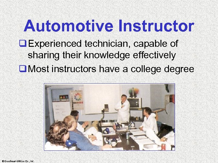 Automotive Instructor q Experienced technician, capable of sharing their knowledge effectively q Most instructors have a college degree © Goodheart-Willcox Co. , Inc.