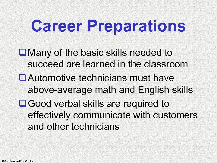 Career Preparations q Many of the basic skills needed to succeed are learned in the classroom q Automotive technicians must have above-average math and English skills q Good verbal skills are required to effectively communicate with customers and other technicians © Goodheart-Willcox Co. , Inc.