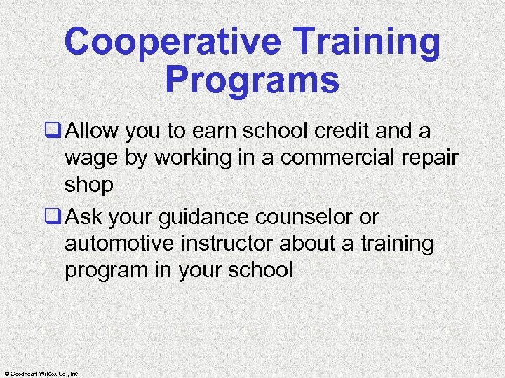 Cooperative Training Programs q Allow you to earn school credit and a wage by working in a commercial repair shop q Ask your guidance counselor or automotive instructor about a training program in your school © Goodheart-Willcox Co. , Inc.