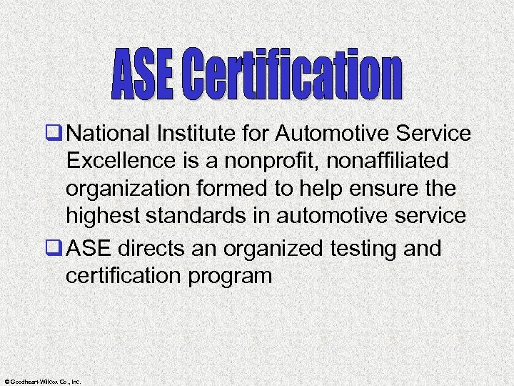 q National Institute for Automotive Service Excellence is a nonprofit, nonaffiliated organization formed to help ensure the highest standards in automotive service q ASE directs an organized testing and certification program © Goodheart-Willcox Co. , Inc.