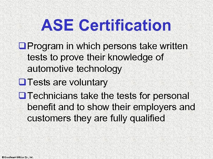 ASE Certification q Program in which persons take written tests to prove their knowledge of automotive technology q Tests are voluntary q Technicians take the tests for personal benefit and to show their employers and customers they are fully qualified © Goodheart-Willcox Co. , Inc.