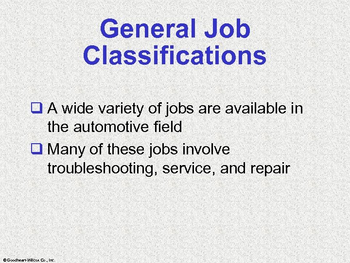 General Job Classifications q A wide variety of jobs are available in the automotive field q Many of these jobs involve troubleshooting, service, and repair © Goodheart-Willcox Co. , Inc.