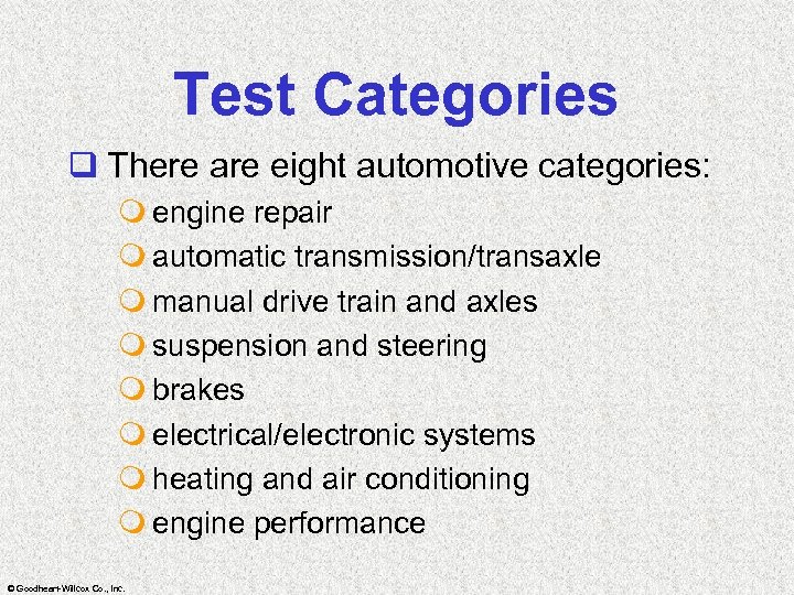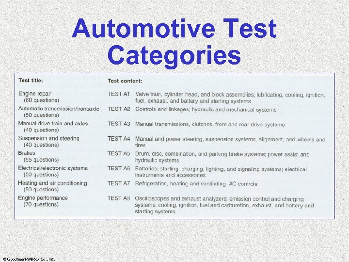 Test Categories q There are eight automotive categories: m engine repair m automatic transmission/transaxle m manual drive train and axles m suspension and steering m brakes m electrical/electronic systems m heating and air conditioning m engine performance © Goodheart-Willcox Co. , Inc.
