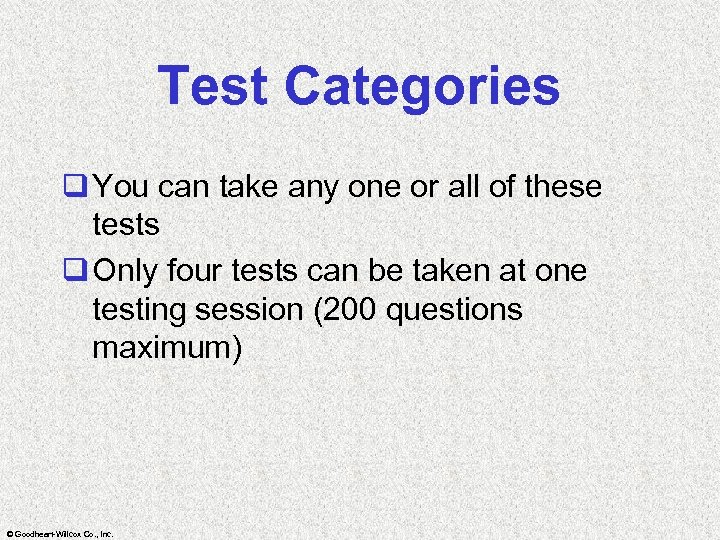 Test Categories q You can take any one or all of these tests q Only four tests can be taken at one testing session (200 questions maximum) © Goodheart-Willcox Co. , Inc.