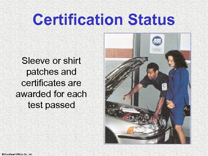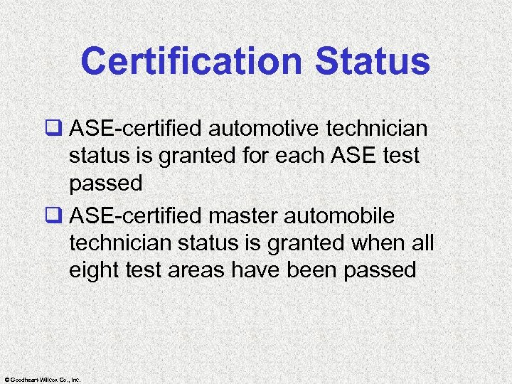 Certification Status q ASE-certified automotive technician status is granted for each ASE test passed q ASE-certified master automobile technician status is granted when all eight test areas have been passed © Goodheart-Willcox Co. , Inc.