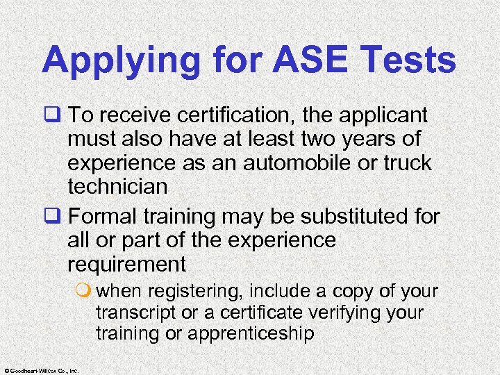 Applying for ASE Tests q To receive certification, the applicant must also have at least two years of experience as an automobile or truck technician q Formal training may be substituted for all or part of the experience requirement m when registering, include a copy of your transcript or a certificate verifying your training or apprenticeship © Goodheart-Willcox Co. , Inc.