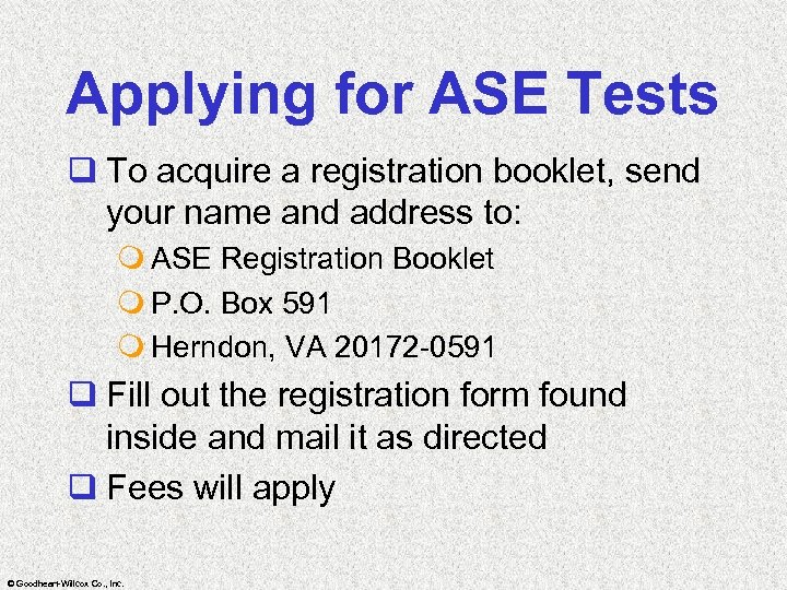 Applying for ASE Tests q To acquire a registration booklet, send your name and address to: m ASE Registration Booklet m P. O. Box 591 m Herndon, VA 20172 -0591 q Fill out the registration form found inside and mail it as directed q Fees will apply © Goodheart-Willcox Co. , Inc.