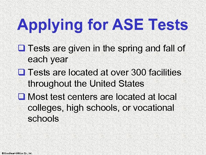 Applying for ASE Tests q Tests are given in the spring and fall of each year q Tests are located at over 300 facilities throughout the United States q Most test centers are located at local colleges, high schools, or vocational schools © Goodheart-Willcox Co. , Inc.