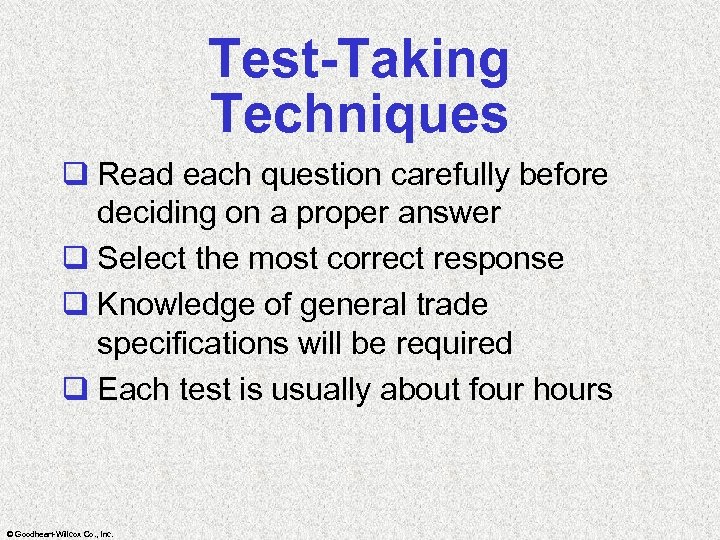 Test-Taking Techniques q Read each question carefully before deciding on a proper answer q Select the most correct response q Knowledge of general trade specifications will be required q Each test is usually about four hours © Goodheart-Willcox Co. , Inc.