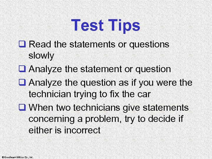 Test Tips q Read the statements or questions slowly q Analyze the statement or question q Analyze the question as if you were the technician trying to fix the car q When two technicians give statements concerning a problem, try to decide if either is incorrect © Goodheart-Willcox Co. , Inc.