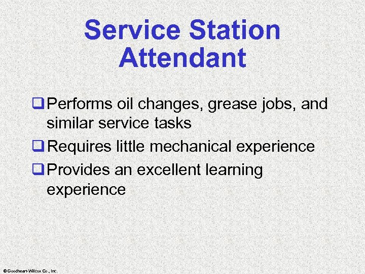 Service Station Attendant q Performs oil changes, grease jobs, and similar service tasks q Requires little mechanical experience q Provides an excellent learning experience © Goodheart-Willcox Co. , Inc.