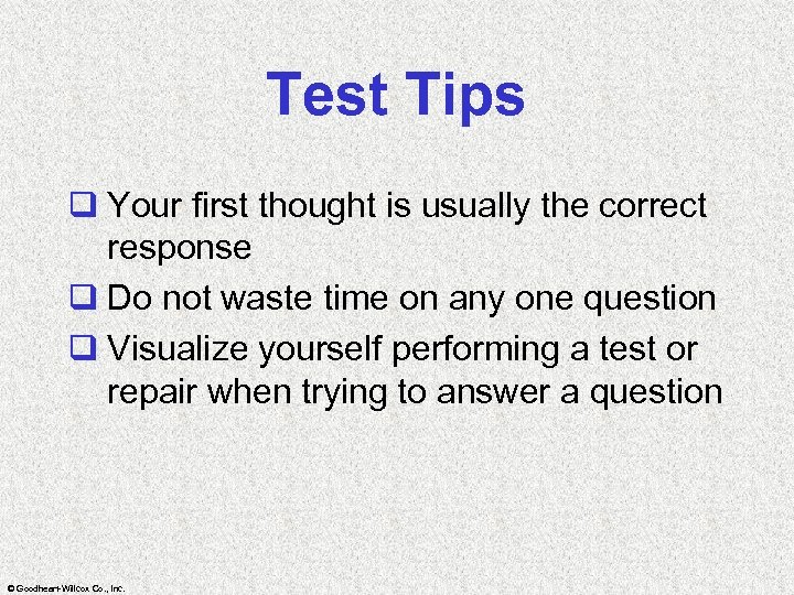 Test Tips q Your first thought is usually the correct response q Do not waste time on any one question q Visualize yourself performing a test or repair when trying to answer a question © Goodheart-Willcox Co. , Inc.