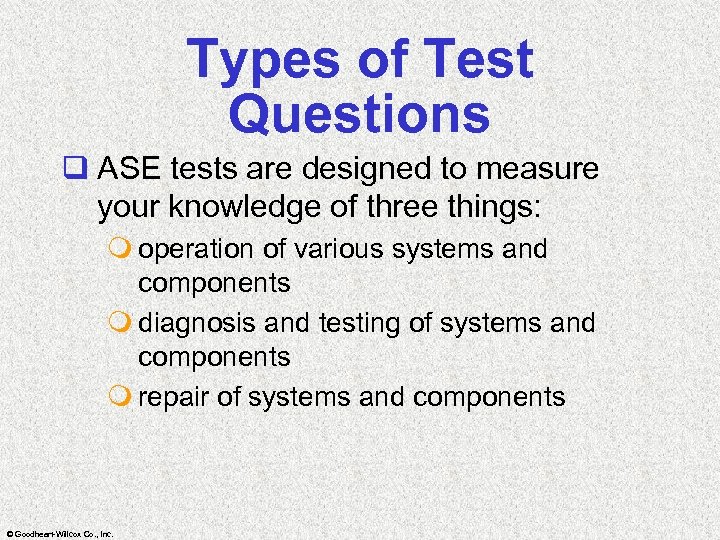 Types of Test Questions q ASE tests are designed to measure your knowledge of three things: m operation of various systems and components m diagnosis and testing of systems and components m repair of systems and components © Goodheart-Willcox Co. , Inc.