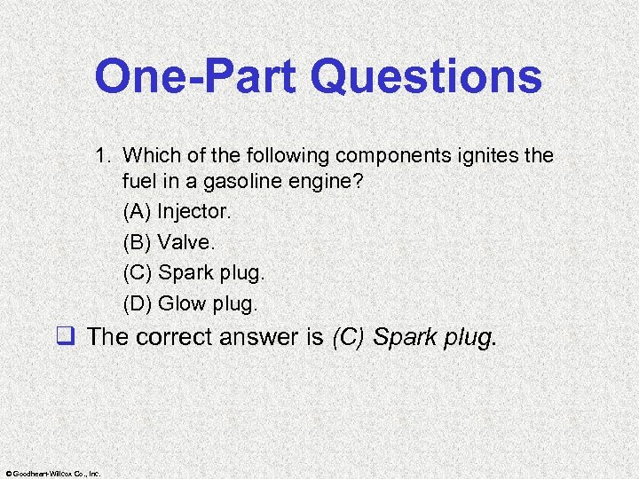 One-Part Questions 1. Which of the following components ignites the fuel in a gasoline engine? (A) Injector. (B) Valve. (C) Spark plug. (D) Glow plug. q The correct answer is (C) Spark plug. © Goodheart-Willcox Co. , Inc.