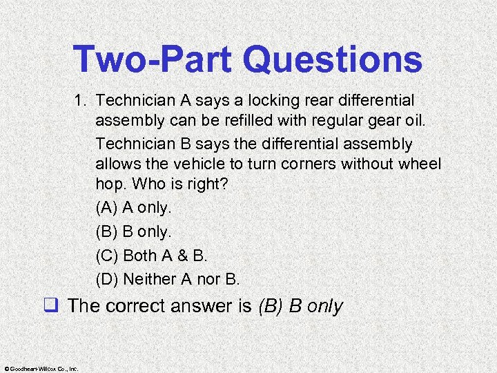 Two-Part Questions 1. Technician A says a locking rear differential assembly can be refilled with regular gear oil. Technician B says the differential assembly allows the vehicle to turn corners without wheel hop. Who is right? (A) A only. (B) B only. (C) Both A & B. (D) Neither A nor B. q The correct answer is (B) B only © Goodheart-Willcox Co. , Inc.