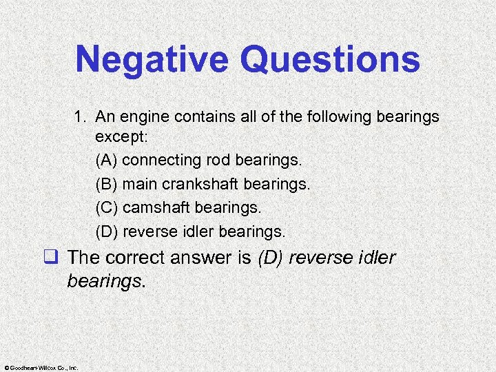 Negative Questions 1. An engine contains all of the following bearings except: (A) connecting rod bearings. (B) main crankshaft bearings. (C) camshaft bearings. (D) reverse idler bearings. q The correct answer is (D) reverse idler bearings. © Goodheart-Willcox Co. , Inc.
