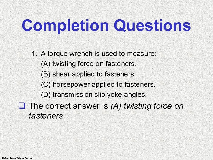 Completion Questions 1. A torque wrench is used to measure: (A) twisting force on fasteners. (B) shear applied to fasteners. (C) horsepower applied to fasteners. (D) transmission slip yoke angles. q The correct answer is (A) twisting force on fasteners © Goodheart-Willcox Co. , Inc.