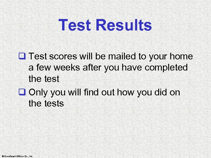 Test Results q Test scores will be mailed to your home a few weeks after you have completed the test q Only you will find out how you did on the tests © Goodheart-Willcox Co. , Inc.