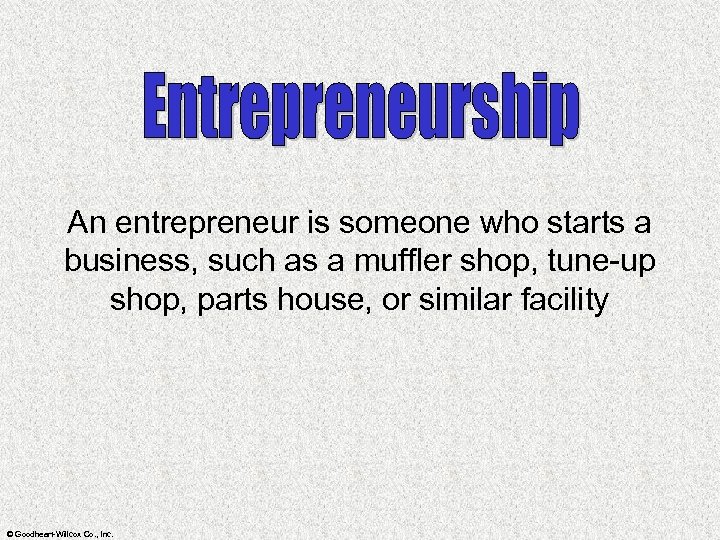 An entrepreneur is someone who starts a business, such as a muffler shop, tune-up shop, parts house, or similar facility © Goodheart-Willcox Co. , Inc.