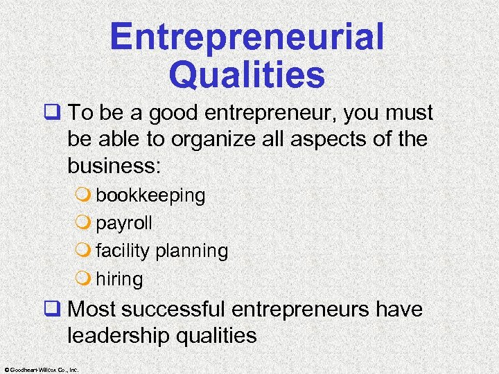 Entrepreneurial Qualities q To be a good entrepreneur, you must be able to organize all aspects of the business: m bookkeeping m payroll m facility planning m hiring q Most successful entrepreneurs have leadership qualities © Goodheart-Willcox Co. , Inc.