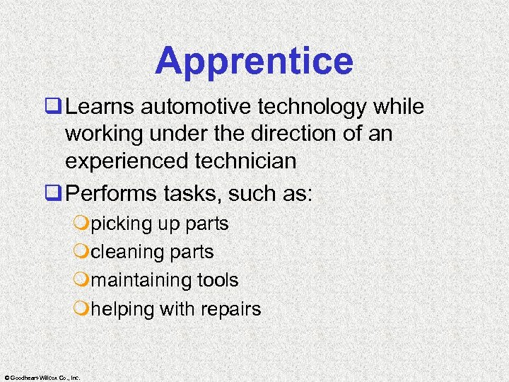 Apprentice q Learns automotive technology while working under the direction of an experienced technician q Performs tasks, such as: mpicking up parts mcleaning parts mmaintaining tools mhelping with repairs © Goodheart-Willcox Co. , Inc.