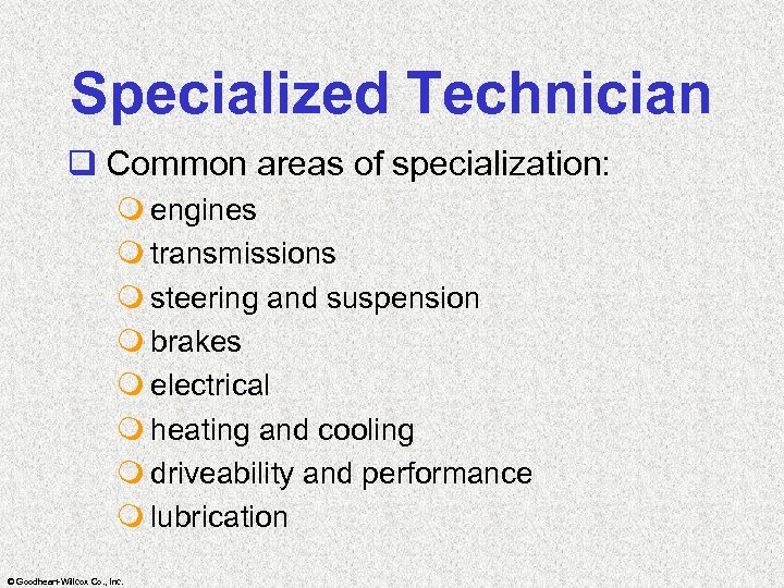 Specialized Technician q Expert on one automotive system q Because of the increasingly complex nature of today’s vehicles, the trend is toward specialization q It is much easier to learn to repair one system than all systems © Goodheart-Willcox Co. , Inc.