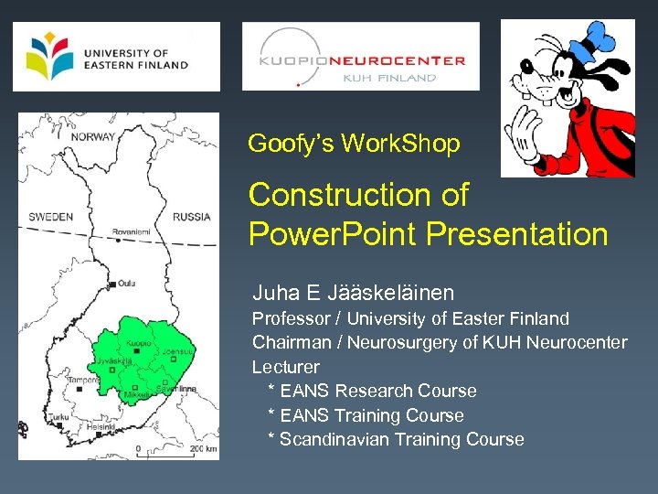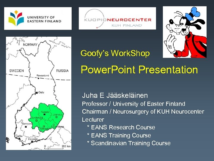 Goofy’s Work. Shop Power. Point Presentation Juha E Jääskeläinen Professor / University of Easter Finland Chairman / Neurosurgery of KUH Neurocenter Lecturer * EANS Research Course * EANS Training Course * Scandinavian Training Course