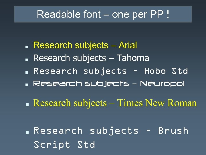 Readable font – one per PP ! n Research subjects – Arial Research subjects – Tahoma Research subjects – Hobo Std Research subjects – Neuropol n Research subjects – Times New Roman n n Research subjects – Brush Script Std