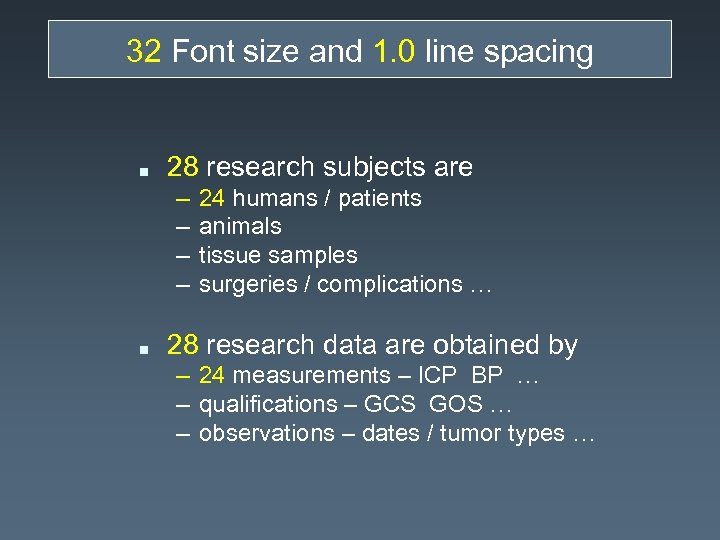 32 Font size and 1. 0 line spacing n 28 research subjects are – – n 24 humans / patients animals tissue samples surgeries / complications … 28 research data are obtained by – 24 measurements – ICP BP … – qualifications – GCS GOS … – observations – dates / tumor types …