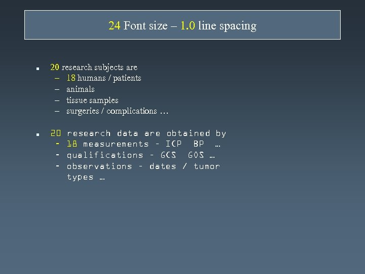 24 Font size – 1. 0 line spacing n n 20 research subjects are – 18 humans / patients – animals – tissue samples – surgeries / complications … 20 – – – research data are obtained by 18 measurements – ICP BP … qualifications – GCS GOS … observations – dates / tumor types …