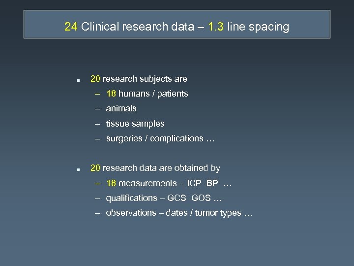 24 Clinical research data – 1. 3 line spacing n 20 research subjects are – 18 humans / patients – animals – tissue samples – surgeries / complications … n 20 research data are obtained by – 18 measurements – ICP BP … – qualifications – GCS GOS … – observations – dates / tumor types …