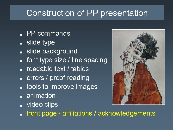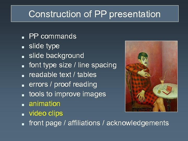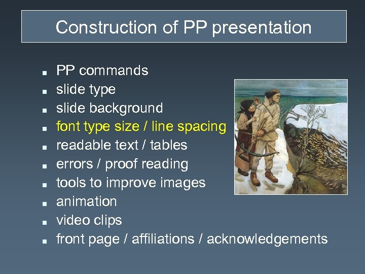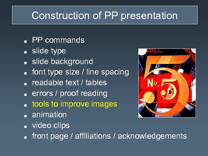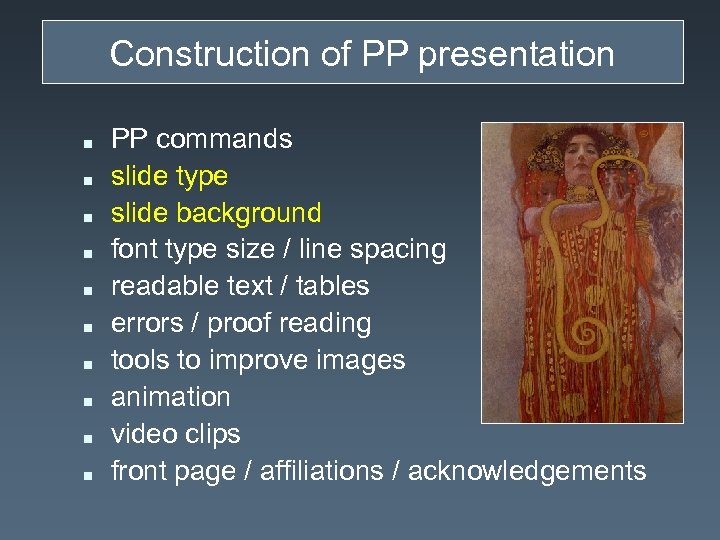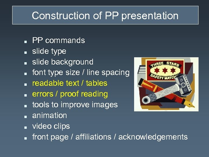 Construction of PP presentation n n PP commands slide type slide background font type size / line spacing readable text / tables errors / proof reading tools to improve images animation video clips front page / affiliations / acknowledgements