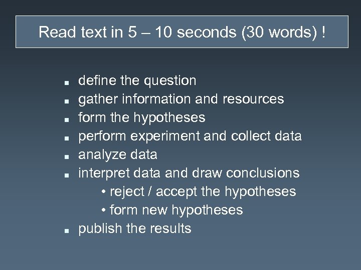 Read text in 5 – 10 seconds (30 words) ! n n n n define the question gather information and resources form the hypotheses perform experiment and collect data analyze data interpret data and draw conclusions • reject / accept the hypotheses • form new hypotheses publish the results