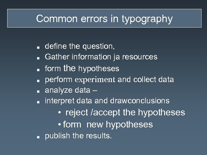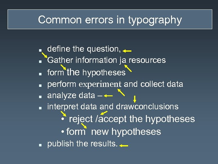 Common errors in typography n n n define the question, Gather information ja resources form the hypotheses perform experiment and collect data analyze data – interpret data and drawconclusions • reject /accept the hypotheses • form new hypotheses n publish the results.